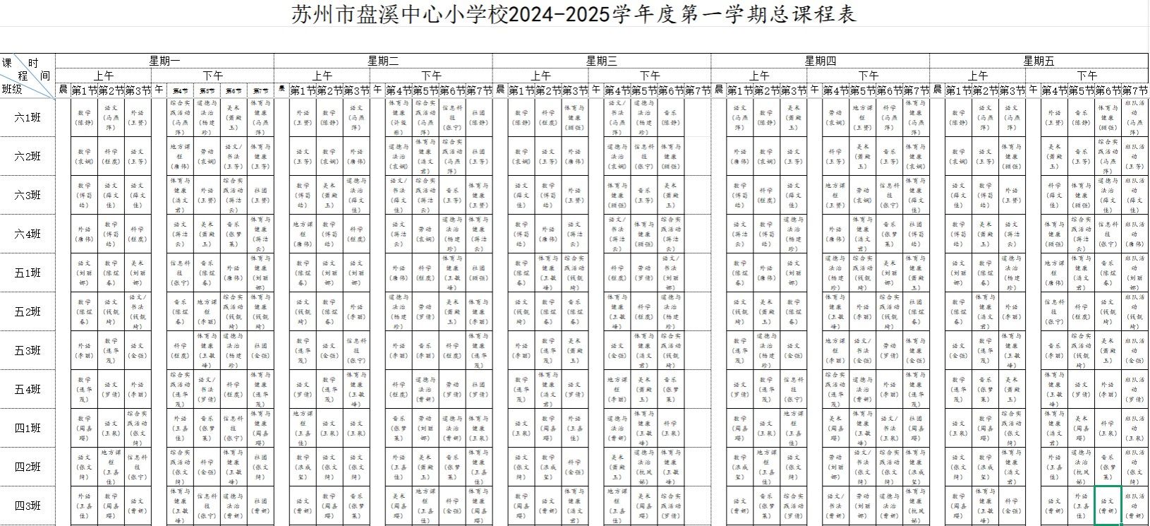 苏州市盘溪中心小学校2024-2025学年总课表