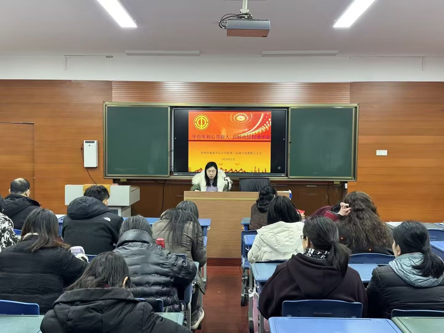 为充分发挥教职工代表大会的职能作用,进一步推进学校工作的全面发展,2026年2月2日下午,苏州市平直教育集团盘溪中心小学三届六次教职工代表大会在多媒体会议室召开,本次教代会以“守百年初心育新人,启时代征程谱华章”为主题,大会在庄严的国歌声中拉开帷幕。